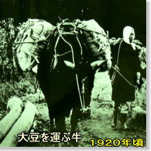 | 橋本市山田、吉原の天然高野豆腐(凍豆腐しみとうふ)作り 〜橋本市史より 紀見峠から岩湧山への登山道の海抜900メートルの尾根沿いで、冬の寒さを利用して、むかし高野豆腐を作っていた作業場の跡にいくつか出会えます。 高野口町伏原の羽右衛門が1807年(文化4年)に岩湧山の山頂近く(五葉谷)で藩の許しを得て、商品として製造を始め、その後橋本市山田、吉原の人も凍豆腐つくりに従事するようになりました。「葛城峰凍豆腐仲間」という株仲間を組織し、江戸後期には、製造技術が大和国や播磨国にも伝わり高野豆腐の名を全国に広めました。 昭和9年(1934)には、但馬や因幡からの出稼ぎも加わり約300人から500人の人が従事した、当地最大の「地場産業」になっていました。 師走の頃から翌年の3月初旬まで冬季のきびしい労働でした。 上の写真のように大豆を牛の背に乗せ、三石山から岩湧山への道を登っていき、冬の寒さを利用するたいへんな仕事ですが、農閑期の副業として現金収入になる魅力のある仕事でした。 明治の末には「葛城凍豆腐製造同業組合」も作られ、大正7年頃には最盛期を迎えました。 その後工場生産の冷蔵凍豆腐や新興産地の増産に押されて次第に生産を減らし、昭和15年には組合も解散しました。 戦後の昭和25年には全ての製造場が閉鎖し、橋本の天然凍豆腐作りも幕が下ろされました。 (凍豆腐作り) 近郷の大豆から作った豆腐を小切りにし、棚場に干し板を並べ、自然の寒気にさらす。凍った豆腐を7〜10日間熟冷させ、熱湯を注いでモドし、絞って水切りし海綿状にする。 その後に、ホイロという乾燥室で乾燥させ約10時間冷まし、形を正方形に整え、千切りを1箱として、木箱に詰めて出荷しました。 「凍豆腐ひき歌」 何の因果で豆腐屋行き習ろた 夜の夜中に豆挽き通し 豆腐屋百日 終(しも)たら帰(い)んで 冬の寒さは 寝て忘れよ |
