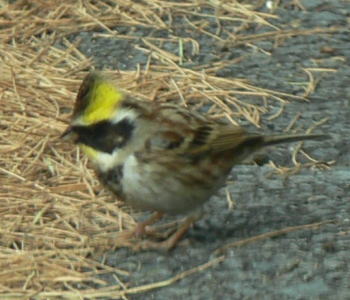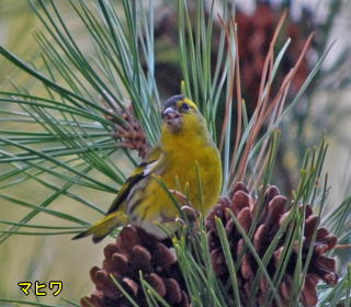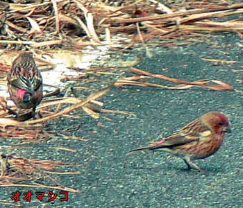 | 吉原から岩湧山への 名前がない「なぞの山」の道は、かつて大豆を背中に乗せた牛が登った、もうひとつの「まめ街道」かもしれません。 その道も今は舗装され材木を運ぶ林道に変わっています。 その道路脇の地面の上で、ハギ類などの草の種や、昆虫類などを盛んに食べる冬の小鳥たちに出会えます。 アトリ科の真っ赤な顔の「オオマシコ」(猿子ましこの顔のように赤いからか)や、ホオジロ科のカナリヤのような黄色い頭の 「ミヤマホオジロ」、それに熊野の妖怪?「アオジ」など群れを作ってエサを採っていました。 2006.12.23