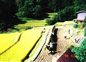 棚田の秋‐――― 稲の刈り入れ (芋谷川の棚田)