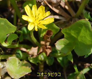 スイバ、ナズナ、カキドオシ、ムラサキサギゴケ、タチツボスミレ、ヒメオドリコソウ、ホトケノザ、タネツケバナ、ハルノゲシ、オニノゲシ、ヤマネコノメソウ