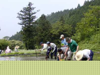 8:30 耕転機で田を耕す(周囲はくわやスコップで)組と、水路を整備する組とに分かれ、それぞれの作業を行う。 10:300 川から水を取り入れる。 11:30 サツマイモの苗の植付け(150本)後、川から引いた水を畝の両側の溝に満たし、その水で苗に水やり。 12:30 昼食。 13:00 サツマイモの苗の周囲と畝全体にワラを敷く(土の乾燥を防ぐため)。 解散。その後、中岡氏が南側のトンネルに通じる畦道の草刈り作業。(〜15:300) ご苦労様! ・谷川からかけ上がってくる風が心地よい。川にはたくさんのサワガニが見られた。タイコウチ、イモリなども。(参加者:井奥・木村・九鬼・中岡・柳本・吉囲)