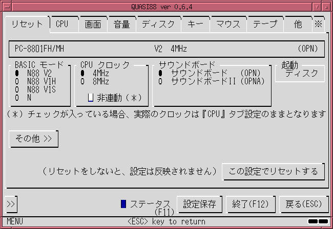 (設定項目の詳細は、PC-8801のマニュアルを見てください。システムの立ち上げをROMにすると、ディスクイメージを読み込まないので注意してください。)