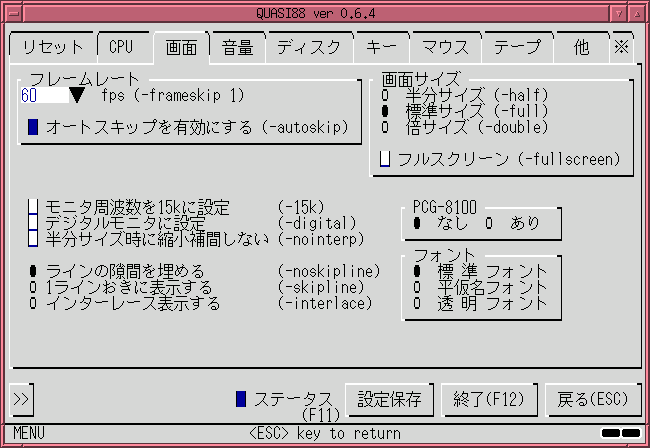 ちなみに半分にすると、320x200ドットで表示されます。この時、簡単なフィルタリングがかかります。仕事中にQUASI88を使うためのモードで