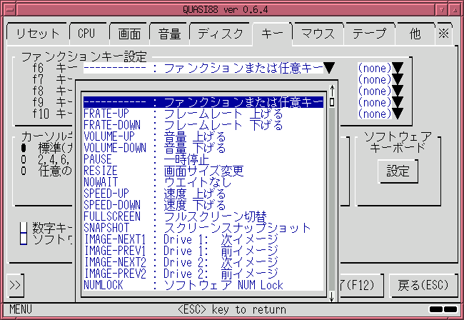 ファンクションキーF6~F10に、QUASI88の各種機能のショートカットを割り当てることが出来ます。