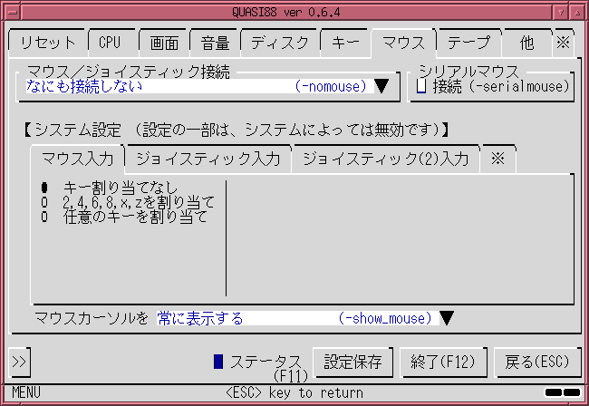 システムのマウスカーソルを非表示にしたり、マウスの感度を変更したり、マウスをシリアルマウスとして接続したりすることが可能です。