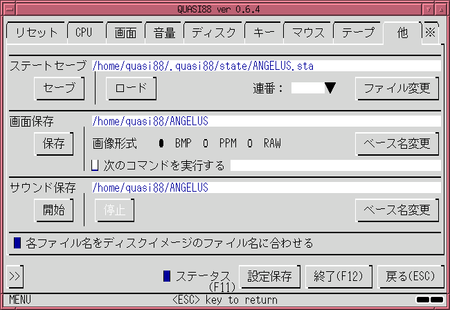 ステートセーブや画面保存、サウンド保存のファイル名は、ディスクイメージのファイル名に連動して変わります。
