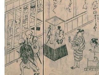 左の絵は、摂津名所図会に描かれた砂場いづみやの店内風景からそばを打っている周辺だけを切り取った場面である。画面左側に何人も並んで打つそば打ち職人が描かれていて、その後ろに立つ二人の男はうどんを踏んでいると思われるが、ひょっとすると、踏んでいるのはうどん玉ではなく、大きなそば玉を踏んでいるのかも知れない。踏んだそば玉を小分けして打つ分業体制になっていたとも考えられる。特に、この時代、これだけの人数の職人が同時進行でそばを打っている図は他に見られない。 ![]() 長谷川光信画の「絵本御伽品鏡」という絵草紙に、大坂の名物風俗を描いた享保15年頃(1731)の蕎麦切屋の店先風景がある。暖簾の字から享保頃のいづみやであるが、その置き行燈(箱看板)に「壱せん・そば切・八文」(一膳八文)とそばの値段が書かれ、その同じ行燈に「うんとん」(うどん)の文字も見える。 *「壱せん・そば切・八文」については「蕎麦の値段」で後述 江戸時代 蕎麦切りが登場するようになって、上方でも江戸でも蕎麦とうどん(うんとん・うんどん)が一緒の店で扱われることが多く、置き行燈などに双方が書かれている絵がいくつも残っている。 ただ、京坂(上方)・江戸の風俗や生活を記録した「守貞謾稿」などによると、江戸時代後期の上方ではうどん屋が主になってうどん屋で蕎麦も扱われ、江戸では蕎麦屋が多くなってうどんは蕎麦屋で売られることが多くなったとされている。 江戸は蕎麦、上方はうどんという様相が出現し出したのは、どうも江戸の中期以降であったことが伺える。 *守貞漫稿の起稿は1837年(天保8年)で、約30年間書き続けられた近世風俗史の基本文献である。 大坂周辺の蕎麦の記述を紹介すると。 「守貞謾稿」には「鶴屋のまんじゅう、川口屋蒸蕎麦、椀屋の蒲鉾・・・」とあり、元禄の頃(1688〜)からの名店・大坂川口屋の繁昌振りが書かれている。 この後、「瓢箪町しなのや」も繁昌する。 「浪華の賑ひ」のなかでは大坂の今宮戎の参道にあたる戎橋筋の様子を記した文があって、「四季の茶屋 白酒屋 ・・・饅頭 菓子 饂飩 蕎麦 切鮨・・」とあって、ここではうどん屋と蕎麦屋がそれぞれ別個に登場している。 「浪華百事談」という書でこんな記述がある。 ひとつは「大手筋錦蕎麦」で、錦蕎麦と呼びて商う蕎麦舗は、大手通り谷町筋より少し西の北側にありしなり。錦蕎麦は古き名にて、その製よろしきを以て大手蕎麦ともいいて、人賞して求めしものなり。とある。 もう一つの「田葉清の蕎麦」については、心斎橋南詰の東半丁ばかりの処に、天保中田葉清(てんぽうちゅう)といえる蕎麦屋あり、尤も尋常の麺類店にはあらず。という。 ただ、いずれの注釈にも、大坂市中で蕎麦のみ打ちて商う店は少なかったとなっているところからも、蕎麦とうどん、更には素麺など麺類全般を扱う店が多かったことがうかがえるのである。 「摂津名所図会」巻之六に「猪名川」の川べり風景があって、網を持って小魚を追う子供や投網を打つ人、行き交う旅人などが描かれていて、客がキセルで一服している葦簀張り(よしずばり)の茶店に貼り布があって「新そば」の字が読みとれる。 秋の「新そば」の頃には、あちらこちらで見られたであろう極くあたり前の風景として描かれていたのである。 元禄頃の名店であった大坂川口屋が「蒸しそば」で売ったという記録が残っているが、同じ元禄の8年(1695)創業から続く大阪・堺の「ちくま」は、蒸籠で蒸して出す熱盛りを現在に伝えている。 宝永・正徳頃(1704〜16)大坂「瓢箪町しなのや」が繁盛していたが享保になって失火によりなくなっていたり、安永6年(1777)刊の富貴地座位・下巻 浪花名物のなかでは和泉屋砂場の賑わいとともに、寂称(じゃくしょう)のそば切という紹介で「新蕎麦の早きしらせ」として登場している。 また、地方からの進出組では天保5年(1834)信州川上そばから心斎橋筋南下町に出店した信州屋などが記録されている。 大坂よりもう少し範囲を広げてみると須磨の敦盛蕎麦、京都本願寺の法要蕎麦、大江山の鬼蕎麦、滋賀の伊吹蕎麦など当時から有名で、兵庫の出石蕎麦も蕎麦処として健在でいまに伝わっている。 また辛味大根や大根のおろし汁で食べる蕎麦について、明和4年(1767)、小浜の町人学者・板屋一助が著した「稚狭考(わかさこう)」巻六に「大根の汁にて麺を喰うを丹後・但馬・丹波にて若狭汁といへり」と書かれている。 こうしてみると、いたるところで蕎麦が商われ食べられていたことがわかる。 商家などの晦蕎麦の習慣はつい最近まであったし、大晦日の年越し蕎麦は多くの家庭に残っている蕎麦についての習わしである。 もともと蕎麦屋の少なかった和歌山でも、年越し蕎麦の習慣は昔からの大切な行事であり、大晦日には家族が揃ってだいたいは温かい蕎麦を食べることになっている。 その和歌山、紀州の付家老水野土佐守の侍医の原田某が、幕末の江戸勤番中の見聞記「江戸自慢」で紀州と