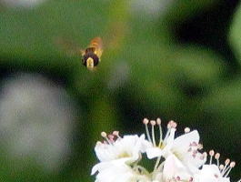 ミナミヒメヒラタアブは「ハナアブ科」で、この種類は仲間が多い 白いソバの花から花へ