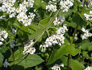写真左は緑色系のメスで大きく 右はオスで小さい 天敵の多いソバ畑では完璧な保護色である
