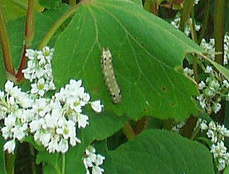 ヨトウムシ(夜盗虫)は食害性害虫の代表格 多くはヨトウガ(夜盗蛾)の幼虫である それにしてもヨトウムシは夜行性の筈だが・・・ 日中のソバ畑でもときどき見かける どちらもヨトウムシの一種だろうが 白いのは「シロイロモジヨトウ」 ?