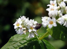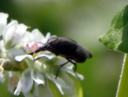 体長は10ミリほど。頭部から長く伸びた吻(口先)で吸蜜しているのでゾウムシの仲間だろうと判断した。 種類や名前の同定を試みたがアルファルファタコゾウムシなど、外見的に似たものもあるがお手上げである。