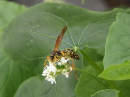 黒と黄色の体長17〜19mmのアシナガバチで、腹部に二つの黄色紋があるので二紋脚長蜂。