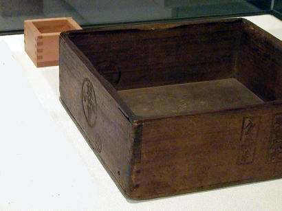 一合枡の手前にあるのが四升枡で、天文5年(1740)と明和3年(1766)の枡改め合格の焼印が捺されているので江戸時代の半ばには既に使われていたことがわかる。さらに、塩仲買組合という焼印も押されていることから塩の計量に使われていたのであろう。