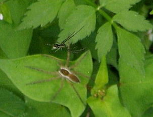 山間の水辺や水田にみられる10数mmのクモで 体も足も細長い 目の粗い水平円網を作っている