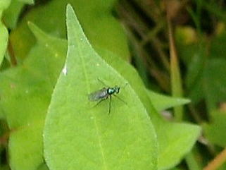 いままで見たどのハエよりもうんと小粒のハエで光沢のある金緑色できれいなのも特徴 13.09.25