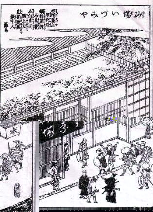 | 江戸の時代には、それぞれ数え切れないほどのそば屋があって、いまも老舗といわれるそば屋は多い。しかし、江戸そばの老舗で代々続いている「のれん御三家」といえば、数ある中でもやはり代表は「藪」と「更科」それと「砂場」である。そして、この御三家のなかで最古参となると、ほんとうは「砂場」だということはあまり知られていない。 「砂場」の発祥は大阪で、いまの大阪・西区新町にあった「津の国屋」「いづみや」というそば屋で、そこは「大坂城築城の砂や砂利置き場」であったので通称「砂場」と呼ばれ、そこにあるそば屋も同様に「すなば」と呼ばれるようになったのである。 寛政十年(1798)刊行された「摂津名所図会」という当時の名所や寺社・旧跡などを紹介した絵入りの名所図会があって、その大坂部四下の巻・新町傾城郭の項に「砂場いづみや」の図がある。 そのそば屋の暖簾には「す奈場」と染め抜かれ、たいそう繁盛している往来の様子と立派な店構えが描かれている。二枚目には店内の様子も描かれていて、そばを食べる客をはじめそばを打ち・茹で・盛り・運ぶなどの百名をはるかに超える人々と、店の切り盛りの様子が克明に描写され、臼部屋の石臼の数などからとてつもない規模であったことが窺える。 まさしく往時の名物そば屋といったところだ。浪速の新町で江戸期を通じて繁盛した名店であったが、残念ながら明治に入って十年ほどの後に姿を消した。 摂津名所図会と 「砂場いづみや」の図