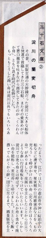 その昔、淀川は京・大阪間の重要な水路で、多くの人や荷物の輸送に三十石船が活躍していた頃の話だ。 その三十石船の乗船客に飲食物などを商うために漕ぎ寄せる小舟を「くらわんか舟」とか「荷売舟」「貨食舟」などと言い、様々なものが売られた中の変わり種として「蕎麦切舟」があり、乗船客にうどんやそば切りを売り回ったという記録が元禄十六年(1703)刊の「立身大福帳」に書かれているという。それによると、伏見の豪商天王寺屋長右衛門の先祖で越後浪人只右衛門が小舟で淀川の夜船へうどん・そば切りを売り始めたとあり、越後騒動で浪人した人物なので天和・貞享(1681〜89)の頃の話しだという。 これが箸袋に書かれたあらましであるが、さらに当時の蕎麦切り舟が使っていたというそば鉢の写真も載せている。小さい写真であり判じがたいが陶器の世界で言う「くらわんか皿」の一種であろうか。 「下手物(げてもの)」という言葉がある。「高価な精巧な品」に対する反対語として使われ、ときに下手物趣味などといって奇妙なものを好む場合の表現に使われたりする。 しかし元々は、陶器など骨董の世界から出た言葉であって、上等な美術工芸品などを「上手(じょうて)」「上手物」と言うのに対して「下手」「下手の物」は、本来は素朴で力強い美しさを持った、かつて日常使われていた簡素であっても捨てがたい趣を持った雑器などをさす言葉なのである。この下手の代表格に古伊万里の「くらわんか」の皿や茶碗がある。 多くはくらわんか舟で使われた酒食を盛った雑器のことで使い捨てであったとする説と、食べ終わった茶碗や皿の数で代金を数えたので、客はそれを川に投げ入れ、勘定をごまかしたとする説がある。いずれにしても、その皿や茶碗が今も淀川の川底から出てきて、世に「くらわんか茶碗」とか「くらわんか皿」といわれている。 古伊万里のほかに、地元高槻の古曽部で焼かれた古曽部焼も多く、さらに遠くは、長崎県の波佐見や愛媛県の砥部で焼かれたものもあるという。 「三十石船とくらわんか舟」のことについては、落語のなかにも「三十石」または「三十石夢の通い路」というのがあって、京見物をして「寺田屋の浜から三十石の夜船に乗る・・・船頭の舟唄につれて川を下り・・・やがて枚方あたりで夜が明けてくらわんか舟が物売りに来る・・・」など、伏見から枚方へと下って行く様子が描写されている。 名所図絵本として安永9年(1780)に初めて刊行された「都名所図会」のなかの「淀の水車:みずぐるま」に、淀川を上る三十石船と貨食舟が描かれているし、滝沢馬琴や十返舎一九も淀川の賑やかなこの光景を書きとどめている。 三十石船は、早船三十石とも呼ばれ京都・伏見から大阪・天満橋詰八軒屋までの約十里を昼夜二回の運行で、下りがおおよそ六時間・上り十時間とほぼ一日とか一晩の行程だった。 下りは流れに順行するが、上りは船頭が岸へ上がって太綱で船を引っ張るから時間も倍、運賃も高く、船頭にもつらい仕事で「下り大名 上り乞食」とさえいわれていたそうだ。 淀川の船運の歴史は平安の頃からといわれ、その淀川水運も最盛期・享保年間(1716〜36)には、三十石船だけで671隻と記録されているし、他の淀二十石船や伏見船(十五石)などを含め、淀川や木津川を行き交う船の数は現在では想像の出来ない状態だったようだ。 また、「くらわんか舟」については、大坂の役で徳川家康側に功績があって、その恩賞に淀川筋の食い物売りの独占権と川舟旗を与えられていたと伝えられていて、それを威光に船客に不作法な商いをし、三十石船に鉤(かぎ)を掛けて固定し「食らわんか よう食らわんか」「銭がないから よう食らわんか」と口汚くどなって酒食を売りつけたことでも有名だ。 その後、明治四年頃に川蒸気船・同じく十年には陸蒸気(おかじょうき)へと時代が移った。 なお、枚方は船番所があったところで、現在は京阪・枚方市駅陸橋側の壁に安藤広重の描いた「三十石船とくらわんか舟」のレリーフが掛かっているし、さらに01年7月3日には、天正年間(1573〜92)に淀川沿いに創業した船宿「鍵屋」について、江戸時代の宿場情緒を再現する歴史資料館「市立枚方宿鍵屋資料館」を開館、ほぼ当時のままの「主屋」や、船着き場の跡、くらわんか舟の模型、当時の「くらわんか茶わん」など往時を偲ぶことができるようになった。 |