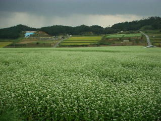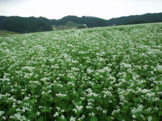 ソバ畑遠景 畑の白い部分が満開のソバの花