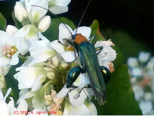 沖縄におけるソバ栽培の取り組み沖縄は日本列島のどこよりも早い季節にソバの花が咲いて虫たちが受粉の手助けをしてくれる。 この写真は琉球列島から台湾まで分布するキムネカミキリモドキで、春に現れるので春のソバを栽培する沖縄ならではの訪花昆虫とソバの花のコラボである。2018年 4月17日 沖縄県の大宜味村のソバ畑で撮影 この写真は大宜味村蕎麦生産組合から提供いただいた。 沖縄でソバの栽培に取り組む活動があると聞いて10年近くになると思う。