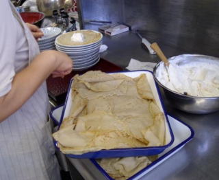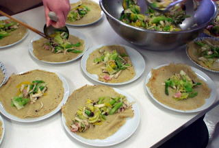 ![]() 大根おろしとネギを入れ、それに出汁をかけたあと花がつおをかける「越前おろしそば」、さらに湯通しした油揚げのきざみとカイワレを入れてみた ![]() 2011年12月例会の差し入れは、三種類の辛味大根はそれぞれ下しで、たっぷりの山芋はとろろ掛けととろろ団子汁に、それぞれの辛味ととろみを32人が楽しんだ。 ![]() 2012年2月例会 料理中央はソバ米とそば団子を入れトマトベースで野菜と煮込んだミネストローネ。 色鮮やかなのは辛味大根のおろし。 ![]() 2012年4月例会 すこし張り込んで一品を鴨南蛮に。 鴨のもも肉を約60枚に薄く切り揃えてもらたので肉屋さんも一苦労。 鴨肉をフライパンで軽くあぶっていったん取出し、その鴨肉の油でネギを焼いて、用意した大なべの蕎麦つゆに入れた。 試食30人に対して5500gの蕎麦を打って、冷たいのと温かいのとつくったがすべて完食。 ![]() 2012年10月例会は新そばをベースに、差し入れの冬瓜とサツマイモ。冬瓜のスープとサツマイモのレモン煮を作ってくれた。好評。 ![]() 2013年2月例会の試食は、出雲へ転居されたTさんがわざわざ試食用にと送ってくれた出雲のそば粉を二八で打った。いつもの冷たいのと温かい掛けそばの二種類で食べ、昔の蕎麦の色を懐かしんだ。 薬味は辛味大根の青と紅色の二種、と刻みネギ。 ![]() ![]() ![]() 2013年10月例会 新そばを高値承知で仕入れた。北海道・沼田産とのことだったが風味ともに乏しく不評。がっかり。 辛味大根は端境期で市販品を購入。一年前と同じで冬瓜、それと大阪の伝統野菜コツマナンキンの差し入れがあった。 ![]() 2014年2月例会 そば粉は青森産を使ったが、それ以外に会として画期的なことは、Hさんが3kgを自家製粉(電動石臼)した北信・小谷産のそば粉を試食用に打った。風味良好。加水率は小谷産45〜%、青森産は48〜%であった。 差し入れの辛味大根は紅白二種。 2015年2月例会 本日は慣れない男のレシピで越前風のぶっかけ。単純かつ大雑把だったが案外好評で完食。 つめたい蕎麦のトッピングは、地元・野崎さんの浮かし揚げをほんの少し湯通しして6mmほどの短冊切り。カイワレ、刻みネギ、たっぷりの花かつお、いつもの辛味大根のおろし、それぞれ好みによってたっぷりと。今回は西洋わさび(ホースラディッシュ)の差し入れもあってこれも擂った。そば粉は北海道上川産で50%前後の加水率。 |