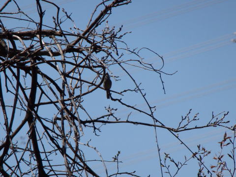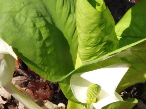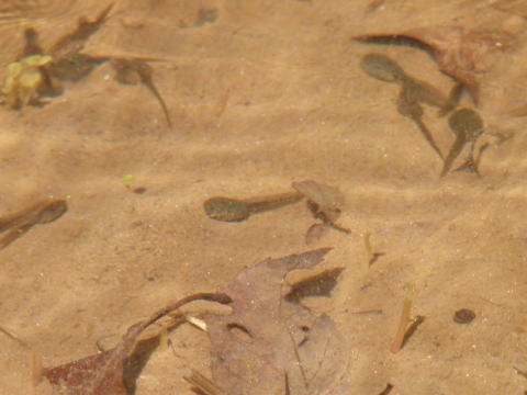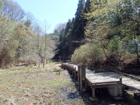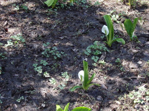 4月初旬、湿原地の風景。ミゾソバの新芽はまだ出ていない。さほど多くはないがミズバショウが咲いている。さらに観察すると、水たまりではオタマジャクシが成長している。ウグイスの鳴くあたりに目を凝らしていると、そのうちに姿を現して鳴いている姿を見せてくれる。