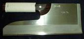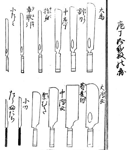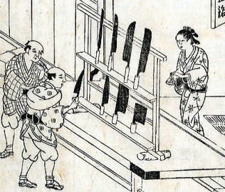 「絵本御伽品鏡」より 「仇敵 手打新蕎麦」より 享保15年(1731) 文化4年(1807) 現在の一般的な「そば切り包丁」の形状大きさ(刃渡り)や重量など 比較するすべはないが一度におおくの蕎麦を、しかも、麺を長く切る必要性から重さと刃渡や刃幅、更に刃が柄の真下(柄が刃の中心付近まで侵入)という工夫がされている。 下左の図は「茶湯献立指南」元禄9年(1696)に書かれた包丁拾弐扱之図、すなわち12種類の用途別包丁である。その中の包丁「蕎麦切」はおそらく「そば切包丁」と記述された初見であろう。 右端の包丁は、ほぼ同じ頃の「羮学要道記」元禄15年(1702)に見える「蕎麦斬包丁」であるが、いずれも基本的には、現在のような特化は見られない。 双方とも「酒餅論」寛文(1661〜)・元禄以降(1688〜)に見る包丁の形状や重量感と極めて似ている。 ![]() 以下は、宝暦4年(1754)に刊行された「日本山海名物図会」(平瀬徹斉著、長谷川光信画) 巻之三のなかにある「堺庖丁」の図の部分である。 出刃・薄刃・刺身包丁・まな箸・たばこ包丁、いずれも名物であるとして、店頭風景が描かれている。 この時代、いままで見てきた包丁との異なる特徴は、刃幅(天地幅)の広い形状が見られる。 *まな箸(真魚箸) |