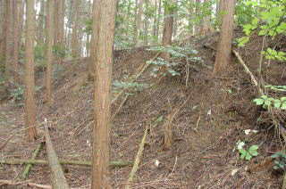 | 案内板の横から急な斜面を這い上がることによって、城域に入ることができるが、あまり手入れがされていない荒れ山であるので、歩き回るのは難しい。しかし、土塁や堀切を明確に見ることができる。 |