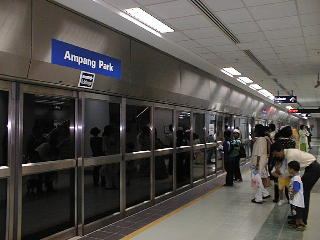乗ってきました!LRTの新区間。6月2日オープンと思っていたら、わたしの思い違いで実は1日にもう開通してました。開通後1ヶ月間は新区間に限り(※2)フィーダーバス も含め無料で乗車できるので、駅によってはものすごい行列ができていました。さて、我が家からいちばん近い駅はDato' Keramatなのですが、数日前に車で近くを 通ったときそのあたりがまだ瓦礫の山だったので、オープンしているのかどうか怪しいと思い、(近いと言っても歩いて15分〜20分はかかるため、行ったわ、無駄足だっ たわ、ではいやなので…)とりあえず確実にオープンしているはずの(※3) Ampang Parkの駅にいってみることにしました。