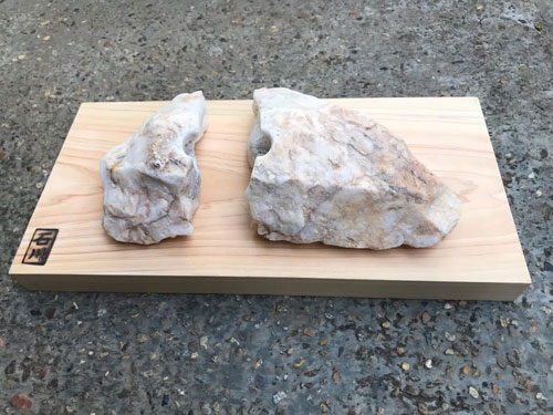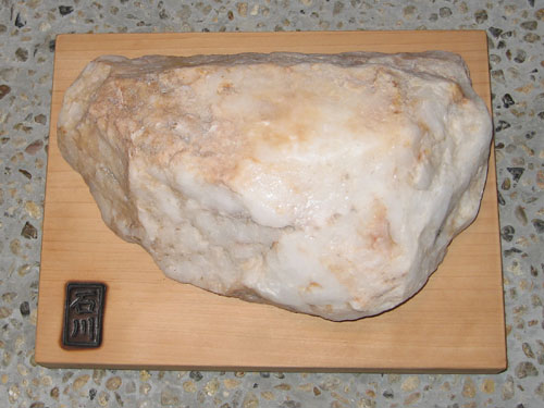 石川虚舟 《 マルセルの頬 》(薔薇は命) 2010 石灰岩、檜(木部 240×185×20mm) バンコク西方のホアヒン。 海岸にイカの甲が散乱していた。 砂浜南端の高台で石灰岩を採集。 イカの甲も、いずれは石灰岩に。 撫でると手のひらに艶、 そして石灰岩は時熟し、 イカが蘇生するかの如し。 パリの、凱旋門の記憶として、 腰掛けた基壇の触感が蘇る。 天地成婚による葡萄酒の如く、 性命双修に熟成(ripeness)を託す。 手のひらに凱旋門の薔薇の艶 虚舟 |