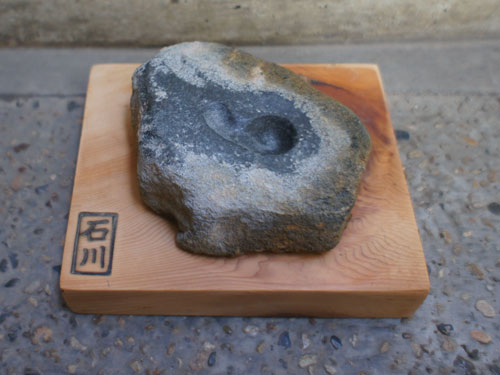 石川虚舟 《勾玉の雌型》 大理石、木製台座部分 (170×140×32mm) photo 2015. 10. 23 2015年10月、ヴェトナムのダナン郊外の山迫る入江へ。近年、リゾート地として開発され、ホイアンの建築様式を模して建設されたホテルに宿泊。その海岸で、表面の粗い、茶褐色の小石を採取。持ち帰り、一部を研磨。 「玉は丸い曲線を有っている。曲妙(まがたえ)と云われるのもそのためである。「まがたま」と云うのもまがった曲線を有っているからである。・・・丸い玉は自然のおのずからなる象徴である。」 九鬼周造『人間と実存』岩波文庫、p.284 ⇒ ヴェトナム紀行 ⇒ 石川虚舟 《随、No.2》 2014 |