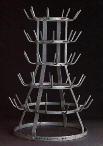 無用 『老子』 第11章 ▲ 「瓶乾燥器」 (Egouttoir)は、瓶の水切り道具である。 その何もない空間に、「水切り」という有用性がある。 さらに、液体を気化する機能は、 「錬精化気」 を表象する。 ⇒ 三関 ⇒ 《『View』の表紙》 ⇒ 石川虚舟 《五徳》 2003 |