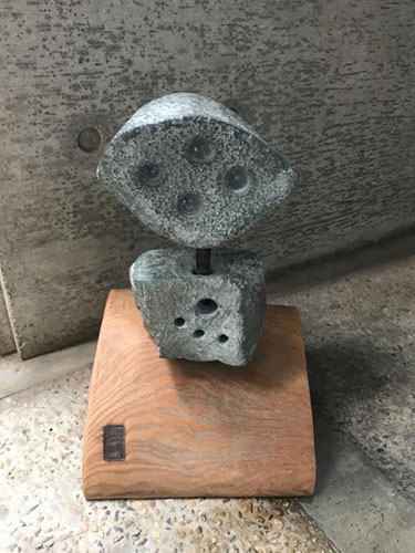 石川虚舟《飄然と No.2》2020 凝灰岩、銅巻鉄心、欅 古法華産の希少な緑色凝灰岩を、耐水性のサンドペーパーで磨くと青銅のような風合いに。銅巻鉄心は避雷針用アースの断片。基台は欅材。 デュシャンは《彼女の独身者達によって裸にされた花嫁、不二》(別名《大ガラス》)で、「性」をロゴス、「命」をエロスに対応させ、ロゴスとエロスの「不二(même)」をテーマとした。 《飄然と No.2》の頭部に両手を置き、双方の親指で「四つの穴」(四象)を擦り続けると、ロゴスとエロスが「不二」となるだけでなく、震兌坎離の融合が会得され、不老長寿も間違いなし! |