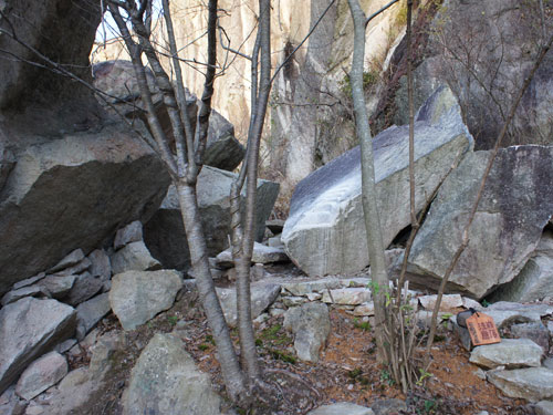 《神気の坐》(中央) photo 2016. 12. 21 ⇒ 前景 天の恵が岩を伝って大地に注ぎ、大地の穴から神気が湧き上がる。天と大地の狭間に静座し、神気を丹田に吸い込み、脊髄から脳、そして天空へと逆流させると、不老長寿となる。 京都北白川の道人、白幽子は、北白川の石切り場跡の岩窟を住いとした。白隠禅師が白幽子から伝授されたという「内観法」は、「内丹」に類するものである。 ⇒ 「白幽子」 2016年 9月14日、山桜の根元に赤土を敷き、杉苔を移植。 9月21日、マチュピチュでの霊験をもとに、《神気の坐》制作開始。 12月7日、《洞天》と《神気の坐》の狭間、整備完了。 |