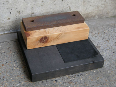 石川虚舟《随》2014 鉄、尾鷲檜、牛革、台座(SPF材に墨塗、251×233×38mm) 15年程前、和歌山県に近い大阪府南部の霊山で「沢」に遊ぶ。 せせらぎに、霊気を浴び錆び付いた鉄片を発見。 「随風庵」に持ち帰り「時熟」させ、此の度、漸く造形作品と化す。 五行説では「金」(金属)は感性を、そして「木」は理性を表象する。 青棒(研磨剤)を擦り付けた牛革で、あたかも清水が流れるが如く、 感性、つまりその「金」を研ぎすませてみよう。 陰陽五行説では、「金」と「木」は『易経』の「兌」と「震」に対応する。 「兌」(沢)の下に「震」(雷)は『随』、 つまり「年少の女」の下に「男」という関係。 ⇒ 石川虚舟《随 No.2》2014 ⇒ デュシャンと易経 |