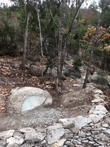 ![]() 《法道仙人に捧ぐ No.2》 photo 2019. 11. 28 ⇒ 《立ち上げ石》へ セザンヌは、1895年から99年の間、南フランスのビべミュスで旧石切り場の小屋を借り、《ビべミュスの石切り場》や《ビべミュスから見たサント=ヴィクトワール山》を描く。 ハイデガーは、セザンヌが描く《サント=ヴィクトワール山》に注目するが、その連作には「隠蔽と明るみの闘争」が・・・ 2019年 7月、《立ち上げ石》周辺に「石坐」と「石卓」の数を増強。その一環として、露出した岩を削り、石坐《法道仙人に捧ぐ》を制作。10月、切石作業の破片を掻き落とし、丸い岩を「隠蔽」状態から「明るみ」へ。出土した石材は「石積」にして、《立ち上げ石》から「セザンヌの岩場」へ上るスロープに活用。 2019年 11月、「非隠蔽化」された丸い岩を《法道仙人に捧ぐ No.2》と命名。南側を凹面に削り、スロープと一体化した小空間を形成。 ⇒ 法道仙人 ⇒ 石川虚舟《セザンヌに捧ぐ》 2013 |