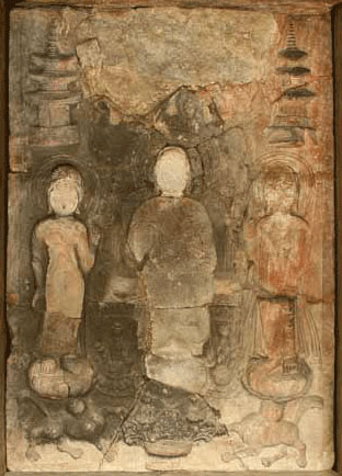 石造浮彫三尊像/播磨・古法華寺 国 ・重要文化財、白鳳時代 中尊は椅子に座し、 両脇侍を獅子が支える。 上の三尊形式に似た唐時代の石像が・・・ ▲ |