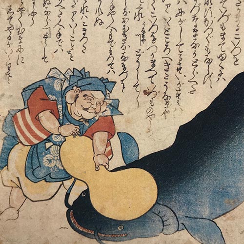 「安政の大地震」直後に、『鯰絵』が多く描かれた。 その大地震を起こすのは「大鯰」という。 でも、「恵比寿」さんが「鯰」を瓢箪で押さえつけてくれる。 「西宮恵比寿」は日本一! ![]() 《鯰を押さえる恵比寿》(部分) ![]() 如拙《瓢鮎図》 「鯰」は、「にしきたスクエア」を象徴するキャラクター。 |