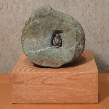 石川虚舟《鑿戸牖以為室》2012 凝灰岩(笠松石)、木部(欅、230×212×88mm) 2009年、バンコクの王宮近くの露店で「布袋」に似た、超小型の人物像(鉛製)を二体購入。写真は、そのうちの一体。別の一体は、背に笠を掛けている。 店番の農婦らしき中年女性が、それらはアユタヤの土中に埋もれていたと説明。 その露店には発売当初、小さな鋳造品を虫眼鏡で調べる客が群がる。 周辺の店舗では、それらに金メッキを施し、数十倍の高値で売られていた。 ⇒ 石川虚舟《 天地の境界 》2018 ⇒ ハイデガーと『老子』 ⇒ ハイデガーの秘密 |