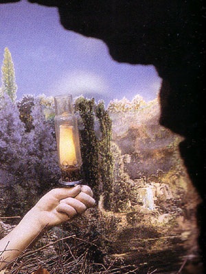 マルセル・デュシャン《遺作》(部分) 「照明用ガス」(輝く気)の背景に「落ちる水」 ⇒ 坎水/離火 |