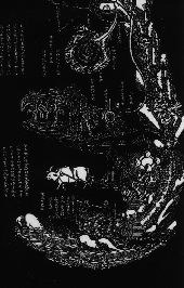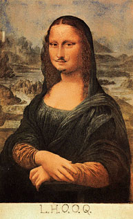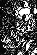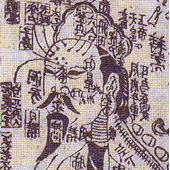 上丹田(脳) 左図は、『内経図』に類似する「内景図」 『事林廣記』(頭部分・左右逆転) 《モナ・リザ》は、九峯山を背景に、 性命双修に基づく「内丹術」を表象。 「モナ・リザの髭」は、 「内景図」に由来するのであろう。 そして、『内経図』の下丹田では 坎水が離火で熱せらる様子が描かれる。 下丹田は臍下三寸に位置し、 「尻の辺が熱い」に一致する。 中丹田(心臓) 下丹田(臍下三寸)