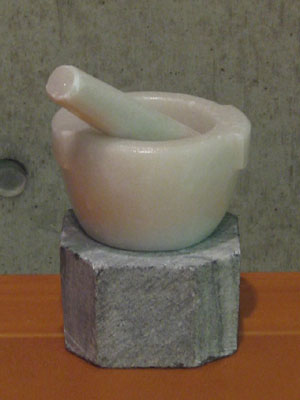 石川虚舟 《 大理石製の遅延 》 2011 大理石製の擂り鉢は、ニンニクをはじめ、複数の食材を混ぜ、すり潰す台所用品。 五行山(ダナン)で購入。 デュシャンの「ガラス製」は、「タブロー」から「遅延」への移行であり、 ここでは大理石製の日常品が、「遅延」(宿り)の芸術作品に移行。 その変化は 玄妙(アンフラマンス) である。 |