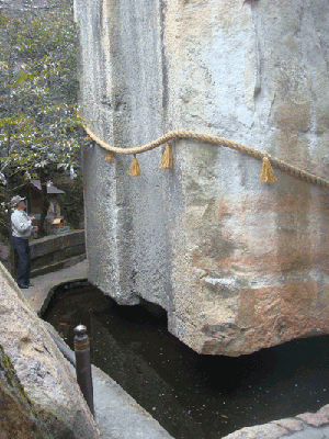原南有作石、形如屋。 長二丈、廣一丈五尺、高亦如之。名號曰-大石。 傳云、聖徳王御世、□□、弓削大連、守屋、所造之石也。 原の南に作り石あり。形、屋の如し。 長さ二丈、広さ一丈五尺、高さもまたかくの如し。名号を大石という。 伝えていう、聖徳の王の御世、□□、弓削大連、守屋、造れる石なり。 587年、物部守屋は、蘇我馬子軍によって敗死。 その百数十年後(8世紀前半)編纂の『播磨国風土記』は、 守屋の死による未完の「作石」について、おぼろげに記載する。 立方体の形状は細部の正確な寸法取りのためであり、 かなり精巧な細工が予定されていたのであろう。 前半部の下をさらに掘り下げれば、巨石は自重で回転し、 後部の三角形の突起が屋根となる。 前方(拝殿側)は急斜面であり、軸線は飛鳥京に向く。 現在、拝殿側は切石で堰き止められ、水が湛えられている。 ■弓削の道鏡と物部守屋 蘇我馬子の崇仏に敵対した物部守屋は、道教を信仰していたのであろう。 福永光司(道教学)は、奈良時代の僧・道鏡が仏教僧でありながら道教も信仰し、 自らの先祖を弓削大連(物部守屋)であると主張したという。 道鏡と物部守屋は共に河内の弓削氏に因縁がある。 道教風の祝詞(延喜式)を唱える西漢氏(かわちのあやうじ)と物部氏との結託説は、 「石の宝殿」が道教の神殿として計画されていたことを裏付ける。 五木寛之・福永光司『混沌からの出発/道教に学ぶ人間学』(中公文庫) ■松本清張説への疑問 家形石棺説否定は首肯できるが、前後の対称形説は両側の山の斜面から判断して無理。 移動困難説も益田岩船石の事例に矛盾。 『松本清張全集55』(文藝春秋); 「私説風土記」、「ペルセポリスから飛鳥へ」 |