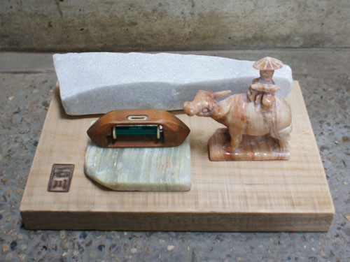 石川虚舟 《織女と牛郎》 杼(既成品)、大理石、木製台座部分 (273×172×28mm) photo 2017. 9. 2 2017年8月初旬、ヴェトナム航空(関空発ホーチミン行)の機内誌で『牛郎織女』(英文)の物語を読む。挿絵には、水牛の背で横笛を吹く牛郎が描かれていたが、それは中国の禅画『十牛図』(騎牛帰家)と同じポーズ。 フエに滞在後、ダナンの海辺のホテルに移動し、「五行山」付近を連日、散策。その際、二つの大理石の小片を採取し、帰国後に研磨。 「牛郎」(大理石)は、2016年3月、手を加えることを前提に「五行山」門前の土産物店で購入し、ヤスリと篆刻用具で削る。 「杼」(ヒ、shuttle)は、10年ほど前に京都の骨董店で購入。若狭湾沿岸地方のものという。 七夕伝説《牛郎織女》は中国発祥であるが、道教の『内経図』では「織女」を「気」に、「牛郎」を「精」に結びつける。つまり、前者は織機で「気」を織り込み、後者は鋤で「精」を大地に植え付けている。マルセル・デュシャンの《大ガラス》は、その『内経図』を典拠とする。 |