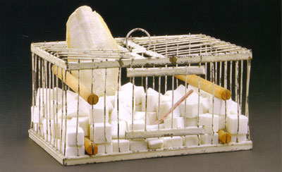 マルセル・デュシャン 《 ローズ・セラヴィ、なぜクシャミをしないの? 》 1921 此両者、同出而異名、 同謂之玄、玄之又玄、衆妙之門、 此の両つの者は、同じきより出でたるも而も名を異にす。 同じきものはこれを玄と謂う、玄のまた玄、衆妙の門なり。 『 老子 』 第一章 小さな鳥かごの中に、大理石の立方体とイカの甲、それに体温計。 ローズ・セラヴィ(別名マルセル・デュシャン)と呼ばれるイカの甲は、石灰質。 モダニスム風邪に感染した大理石の立方体(キュビスト)もまた、 同じ石灰質でありながら名を異にする。 大理石のもと(玄)の姿、その扁平さのお陰で、 ローズは鳥かご(モダニスムのパリ)を脱出し、 ニューヨークへ旅立つ。 |