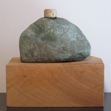 石川虚舟 《時熟》 2012 コルク、凝灰岩(笠松石)、欅(213×120×94mm) 時折、コルク栓を抜き、ワインをほんの少し注ぐ。 時がつれ、ワインが凝灰岩に滲み渡り、そして作品はいつしか「時熟」する。 ⇒ 石川虚舟、《僊窩》時熟 「コルク栓抜き」の場合、スクリューが前進すると、コルクが後退する。 日常的機能を無にした「コルク栓抜き」のアナモルフォーズは、「反転運動」の指標となる。 |