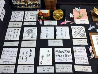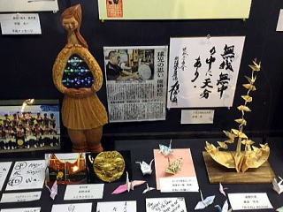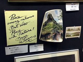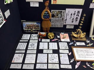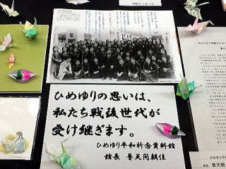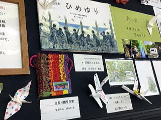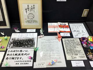 <概要> ・本校の3年生は5月に修学旅行沖縄に行き、生徒たち全員が平和への祈りと平和宣言をしました。ひめゆり平和記念資料館の理事をされていました故 宮城喜久子先生がH24年6月に本校の生徒達に語っていただいた戦争体験が最後のメッセージとなりました。最後に訴えられましたメッセージを展示。宮城先生から贈呈していただき、「命ど宝」と揮毫された絵本「ひめゆり」は本校の宝物です。H28年、ひめゆり平和資料館の島袋館長様、H30年に普天間新館長様よりメッセージが届きました。戦後70年より地域から生徒たちと平和へのメッセージを発信したくて、本年も展示を企画しました。すべての展示作品から平和への熱い願いを感じ取っていただければ幸いです。また、様々なジャンルでご活躍の方々の作品やメッセージも展示させていただきました。今回のピースメッセージ展(平和の風)から一人一人が身近なところから平和と友情のネットワークを築いていってくださることを念願しています。