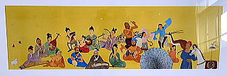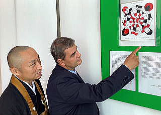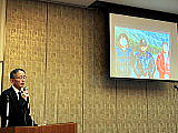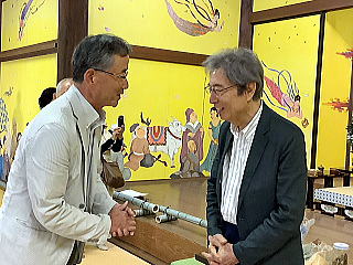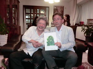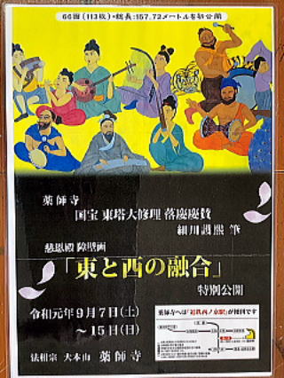 細川護煕先生から障壁画奉納一般公開のご招待をいただき鑑賞させていただきました。絵の解説ありがとうございました。東西融合の平和への道が未来まで文化交流、相互理解「人間の尊厳」「自然との調和」「未来の世代への責任」を感じます。新たなシルクロードとして人々がにぎわい音楽を楽しみながら行き交う、夢踊る未来さえも予感させる作品でした。 |