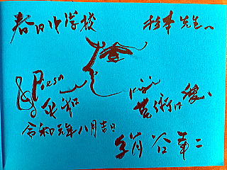 この度は、ご多忙の中、お心遣いのお手紙と作品をお贈りいただき、厚く御礼申し上げます。生徒たちに「ピースメッセージ」として薬師寺の慈恩殿障壁画正面北側の作品を特別に作成していただき感謝申し上げます。額装された先生の真心の作品は生徒たちにとって最高のプレゼントとなりました。早速、生徒たちに披露させていただきました。大感動です。校内に一足早く平和の風が吹きながれ春の訪れを感じています。学校の宝物として永久保存展示させていただきます。先生の作品は、新たなシルクロードとして人々がにぎわい音楽を楽しみながら行き交う、夢踊る未来さえも予感させる素晴らしい作品です。響きわたった平和な空間での先生のお話しを思い出しながら、先生の素晴らしい作品に出会えたことに深く感謝申し上げます。未来の宝である子供たちにも語り継いでいきます。また、先生にお会いできますこと楽しみにしています。