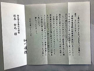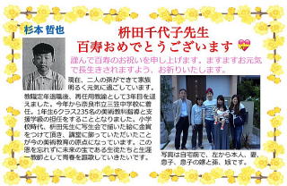 飛鳥小学校の3、4年の担任であった枡田先生が百寿を迎えられます。ハガキと写真は白寿の時のものです。当時の学級委員長がメッセージカードを編集してくれましたのでご覧ください。