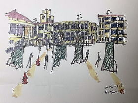 右の作品は、奈良県図工美術教育研究会会長をされた稲葉元英先生(元 春日中校長)からいただいた創立50周年記念に描かれた校舎のスケッチです。長年にわたって奈良市の美術教育のご指導に貢献されました。文科省の海外視察で描かれた素敵なスケッチと文が奈良新聞で連載されていたことが懐かしいです。 2020.5.21 |